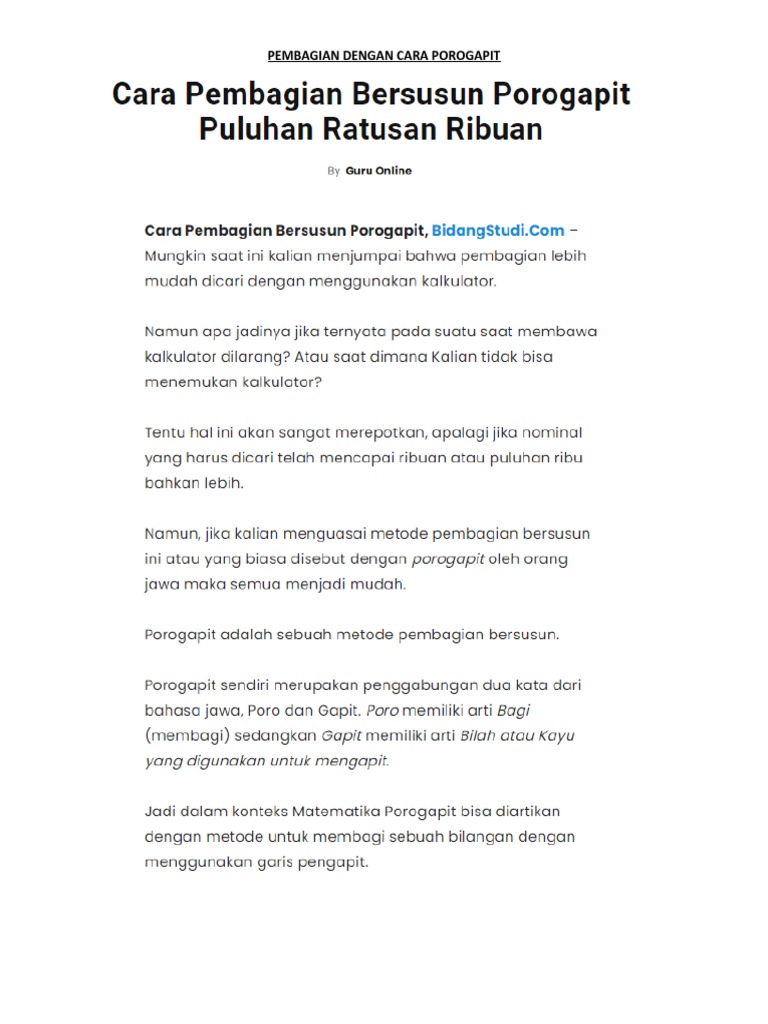 Porogapit cara pembagian bersusun mudah tanpa kalkulator. Untuk menyelesaikan pembagian bersusun ini dibedakan menjadi 2 macam, yaitu pembagian bersusun panjang dan pembagian bersusun pendek. #porogapit#pembagiansusuncara membagi bilangan ribuan dibagi dengan puluhan dengan cara bersusun atau porogapit. Dikutip dari buku 'sekali baca langsung inget semua soal kelas 3 sd/mi' terbitan kunci aksara, pembagian dapat dilakukan dengan cara pengurangan berulang, sampai sisanya 0. Selesaikan pembagian di bawah ini dengan bersusun panjang.