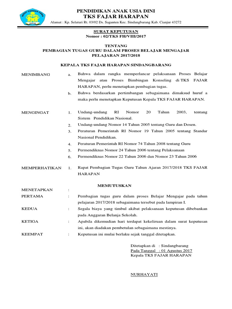 Sk pembagian tugas guru paud 2020. Pengertian daftar pembagian tugas mengajar adalah surat keputusan yang ditetapkan kepala sekolah paud dalam membagi tugas mengajar tenaga pendidik di lembaga yang dipimpinnya. Contoh sk pembagian tugas guru sk kbm wahyu setiyono. Sk pengangkatan tenaga pendidik dan kependidikan paud paud jateng. 07092015 download contoh buku daftar pembagian tugas mengajar tenaga pendidik guru paud tk kb tpa sps dalam format doc yang dapat di edit.