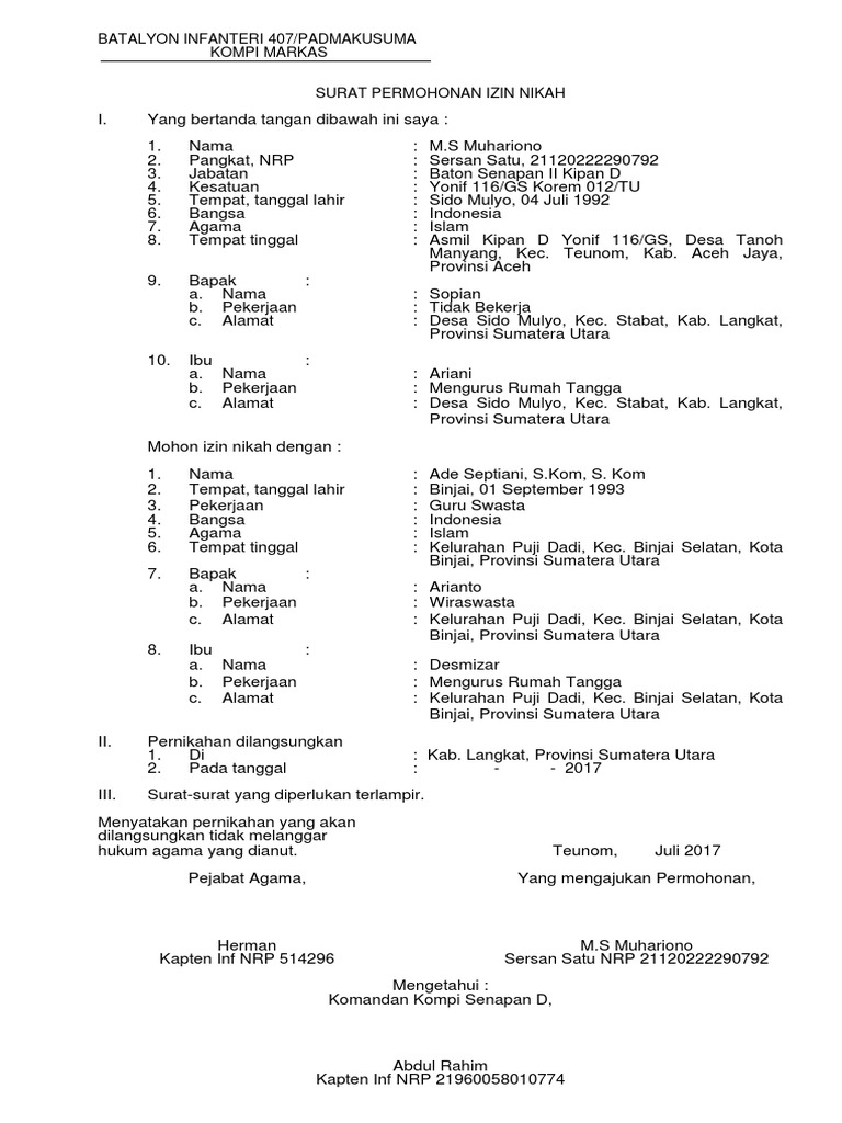 Dalam tradisi pernikahan adat jawa dikenal istilah tradisi langkahan. Bismillahirrahmaannirrahiim, astaghfirullahal'adzim, asyhadualla illa ha illallah, wa asyhadu anna muhammadarrosulullah. Biasanya, prosesi langkahan dilaksanakan oleh calon pengantin sebelum melakukan serangkaian prosesi persiapan pernikahan dan hanya dihadiri oleh anggota keluarga dan kerabat dekat. 15 contoh surat izin tidak masuk sekolah terbaru dan terlengkap. Prosesi inilah yang sering membuat anak dan orang tua menangis haru. Syarat nikah secara islam kua hingga siri penjelasan. Contoh surat izin menikah lagi picture uploaded ang uploaded by admin that saved inside our collection. Inilah pembahasan selengkapnya mengenai teks izin menikah kepada orang tua. Thanks so much mbak anggi widjanarti dari lovejournal.widjanarti.com. Prosesi izin nikah bukan hanya sekedar mengikuti sebuah susunan acara, tapi jadikan momen tersebut sebagai wujud cinta kepada orangtua yang telah menemani langkah mu hingga gerbang pernikahan. Mulai dari ucapan terimakasih atas ketulusan cinta mereka hingga permohonan maaf dan restu agar memiliki rumah. Jorok banget berty… 😀 ini yang aku ucapin saat memohon untuk menikah : Sebelumnya tyas mohon maaf, bila banyak kesalahan dan kekhilafan, baik yang sengaja maupun enggak disengaja, ujar tyas.